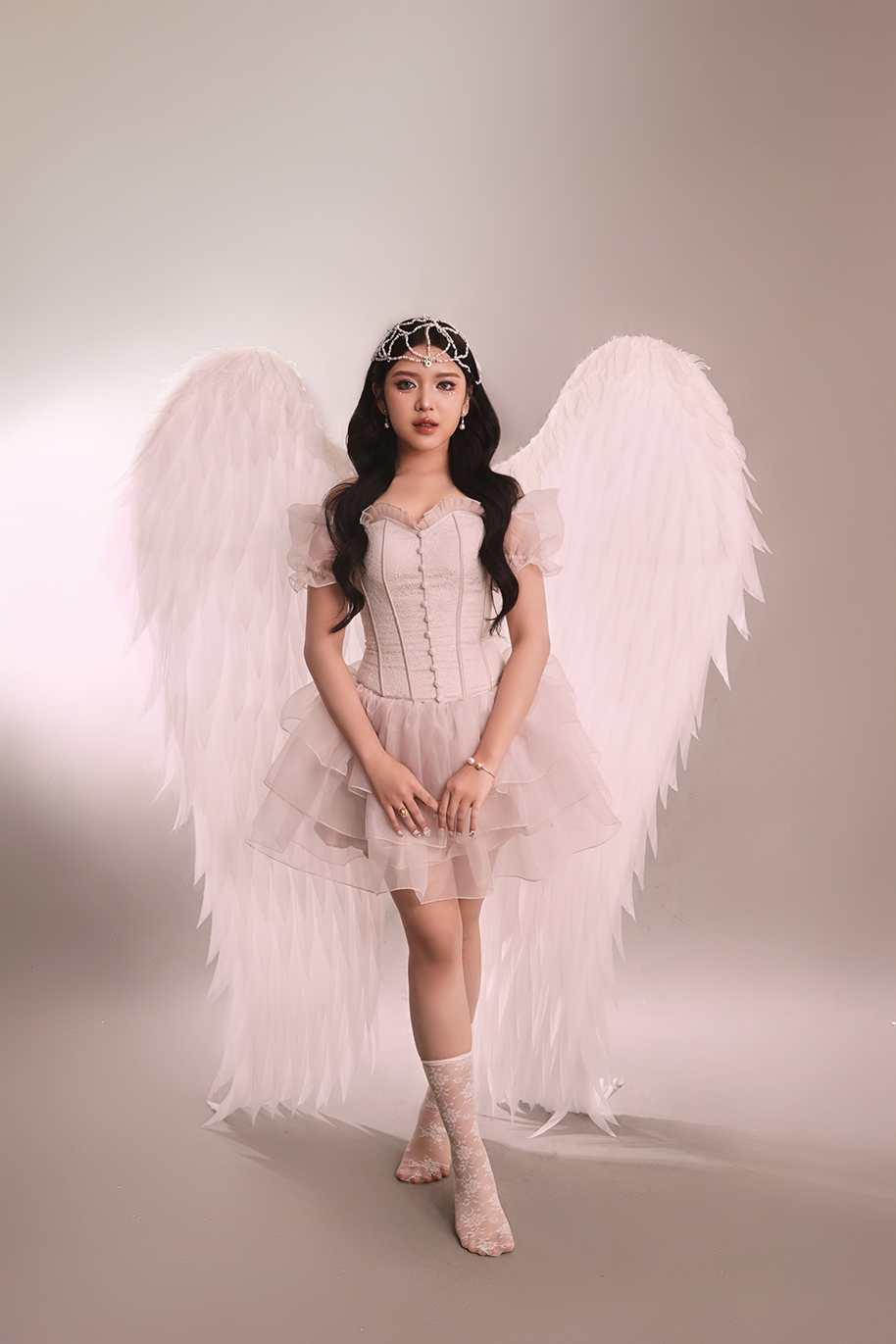 Sayap putih dan hiasan kuku senada melengkapi penampilannya, seolah merepresentasikan sisi lembut namun kuat dari dirinya.